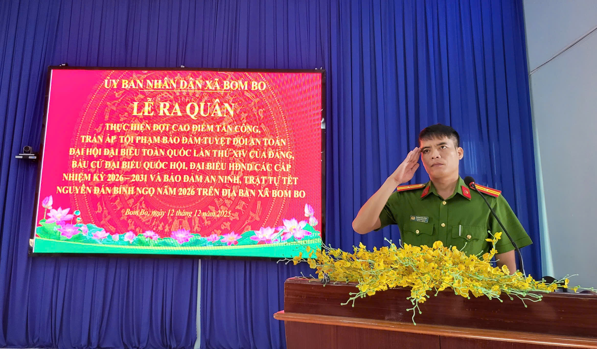 Tại buổi lễ, Thiếu tá Trương Văn Hồng – Trưởng Công an xã Bom Bo đã triển khai các nhiệm vụ trọng tâm trong đợt cao điểm như: Tăng cường các biện pháp nghiệp vụ, chủ động nắm chắc tình hình, kịp thời phát hiện, đấu tranh, trấn áp các loại tội phạm, tệ nạn xã hội; đẩy mạnh công tác tuần tra, kiểm soát, bảo đảm trật tự an toàn giao thông và an toàn xã hội dịp trước, trong và sau Tết Nguyên đán Bính Ngọ 2026, cuộc bầu cử đại biểu Quốc hội khoá XVI, bầu cử đại biểu HĐND các cấp nhiệm kỳ 2026-2031 và Đại hội đại biểu toàn quốc lần thứ XIV của Đảng.