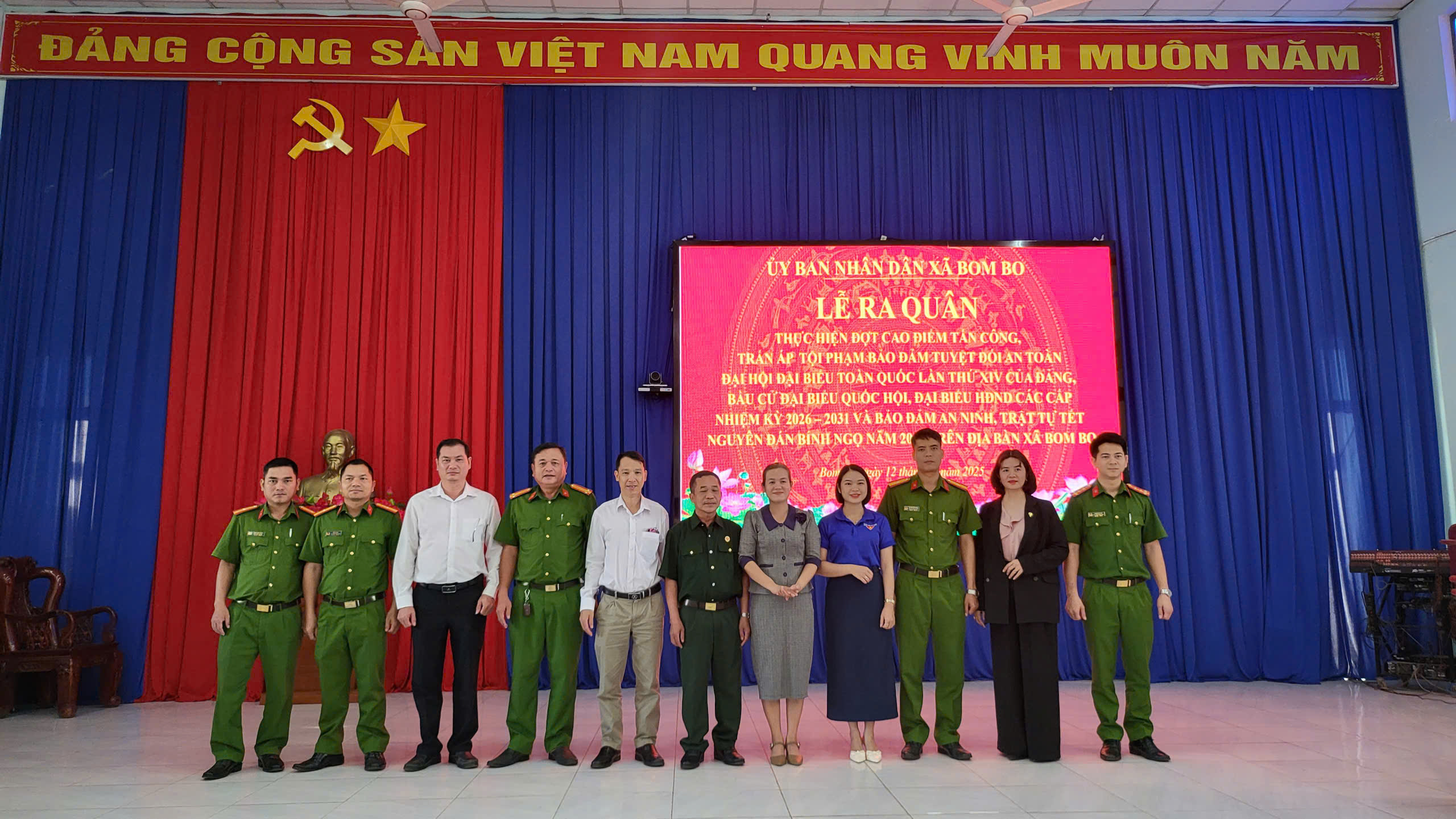Sáng ngày 12/12/2025 Công an xã Bom Bo tổ chức Lễ ra quân thực hiện cao điểm tấn công, trấn áp tội phạm, nhằm bảo đảm tuyệt đối an ninh, trật tự phục vụ Đại hội đại biểu toàn quốc lần thứ XIV của Đảng, bầu cử đại biểu Quốc hội khóa XVI, đại biểu HĐND các cấp nhiệm kỳ 2026–2031 và Tết Nguyên đán Bính Ngọ năm 2026.