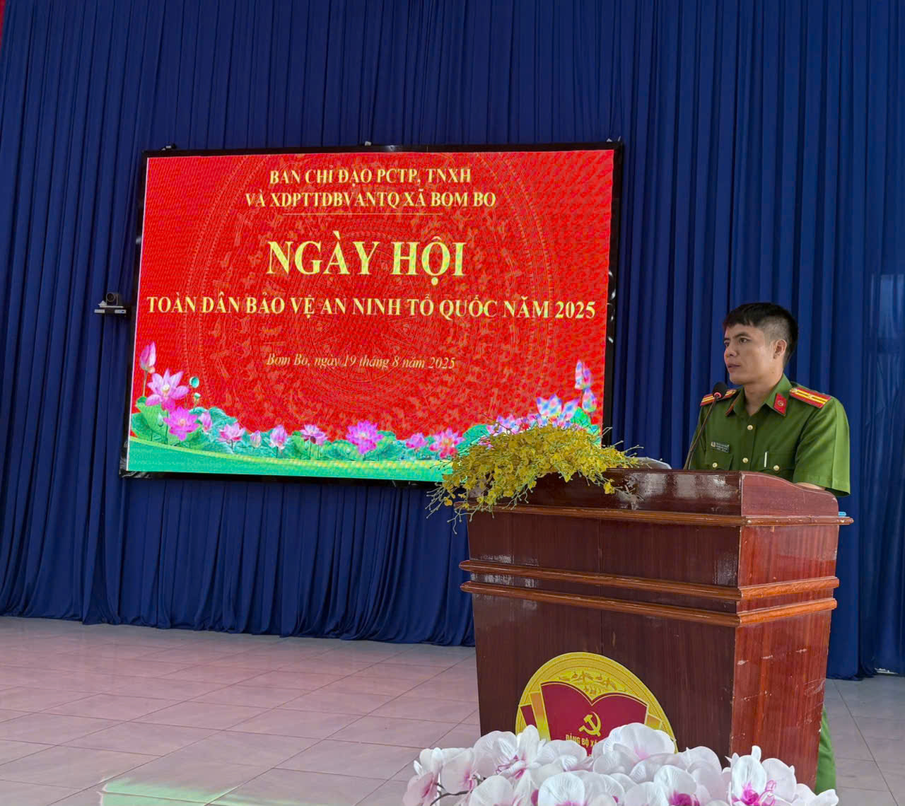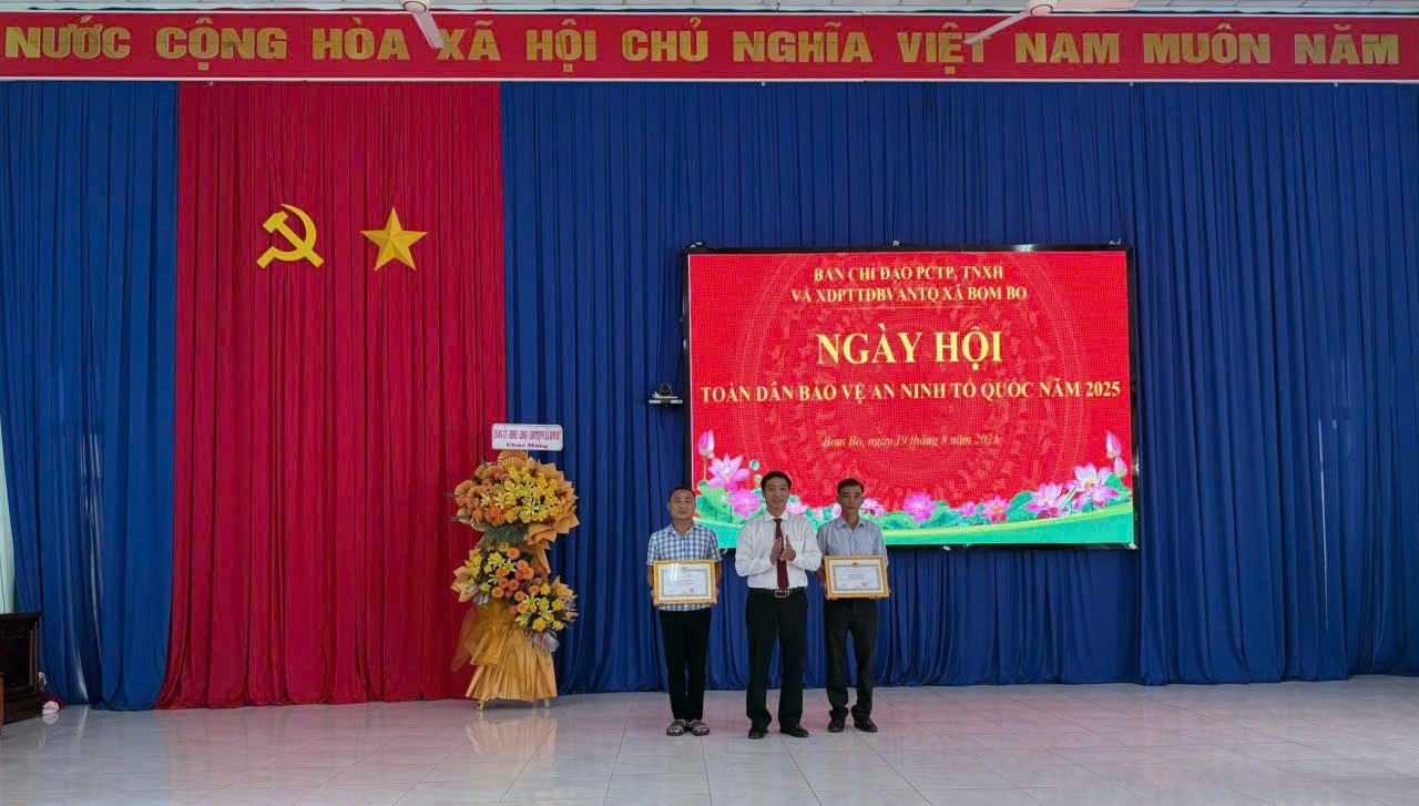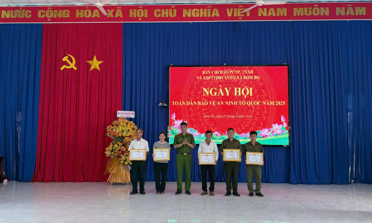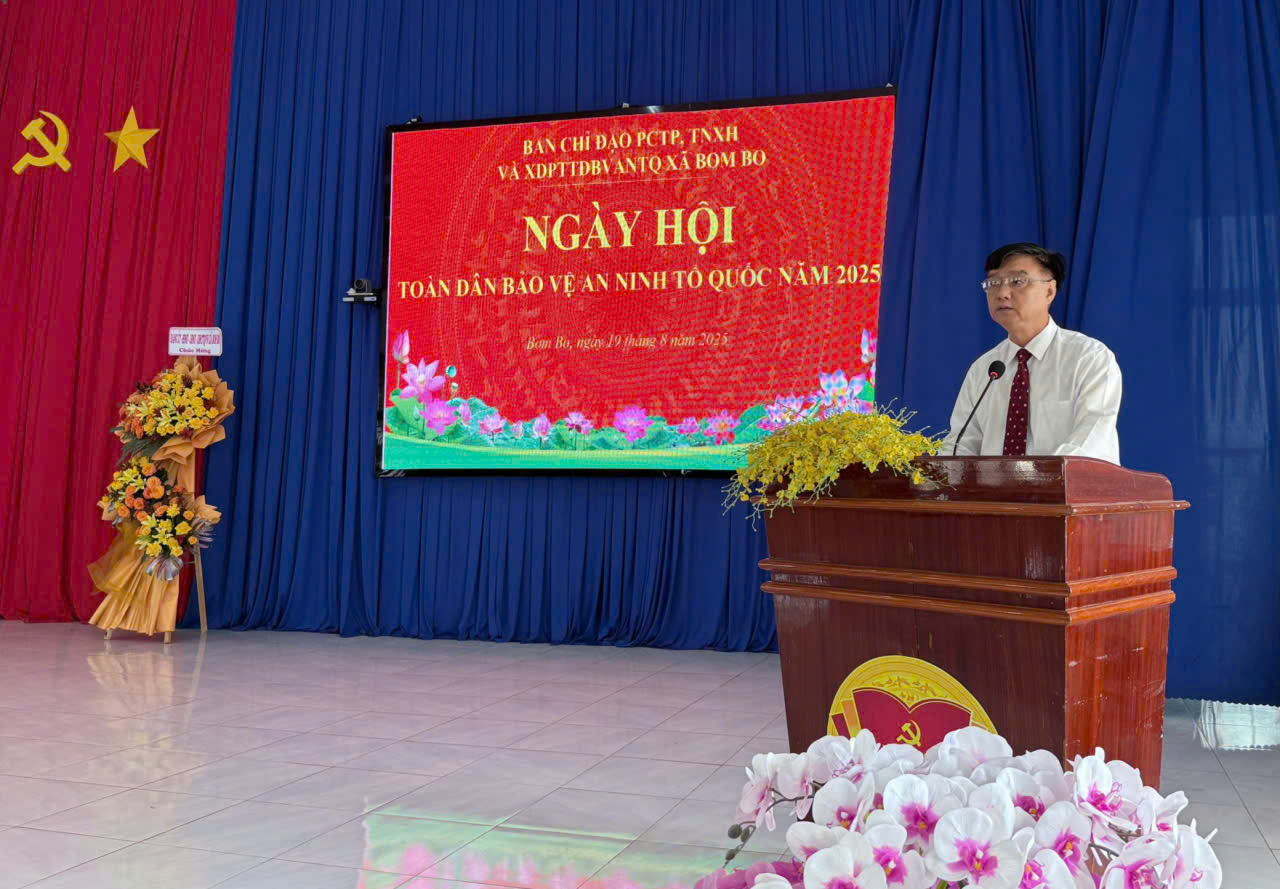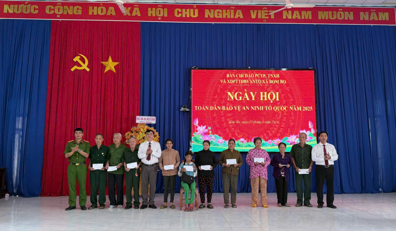 Sáng ngày 19/8/2025, Ban chỉ đạo PCTP, TNXH và PTTDBVANTQ xã Bom Bo đã tổ chức ngày hội toàn dân bảo vệ an ninh Tổ quốc, tại Hội trường Ủy ban nhân dân xã. Sự kiện này có ý nghĩa đặc biệt khi được tổ chức đúng dịp kỷ niệm 80 năm Cách mạng tháng Tám thành công, 80 năm ngày truyền thống Công an nhân dân (19/8/1945 - 19/8/2025) và 20 năm Ngày hội toàn dân bảo vệ an ninh Tổ quốc (19/8/2005 - 19/8/2025). Đây là dịp để toàn thể cán bộ, chiến sĩ và nhân dân xã Bom Bo ôn lại truyền thống hào hùng, đồng thời tôn vinh những cống hiến thầm lặng của người chiến sĩ Công an nhân dân vì sự bình yên của quê hương.
