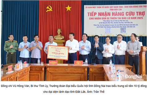 Phát biểu tại buổi lễ, đồng chí Vũ Hồng Văn, Bí thư Tỉnh ủy, Trưởng đoàn Đại biểu Quốc hội tỉnh Đồng Nai bày tỏ sự chia sẻ sâu sắc trước những thiệt hại nặng nề về người và tài sản mà nhân dân các địa phương phải gánh chịu, trong đó có tỉnh Đắk Lắk. Thay mặt Tỉnh ủy, HĐND, UBND, Ủy ban MTTQ Việt Nam tỉnh Đồng Nai, đồng chí Vũ Hồng Văn đã trao 10 tỷ đồng hỗ trợ tỉnh Đắk Lắk khắc phục hậu quả thiên tai, khôi phục sản xuất, sớm ổn định cuộc sống nhân dân.