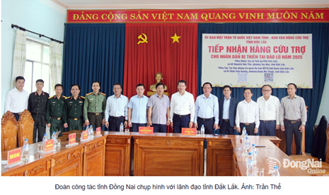 Cùng với trao kinh phí hỗ trợ, tỉnh Đồng Nai thành lập đoàn công tác có 293 người tham gia gồm: lực lượng y, bác sĩ, nhân viên y tế; đoàn viên thanh niên; hội chữ thập đỏ và các lực lượng tình nguyện viên mang theo thuốc men, phương tiện chuyên môn, vật tư y tế và nhiều phần quà, nhu yếu phẩm thiết yếu để hỗ trợ nhân dân tỉnh Đắk Lắk vượt qua khó khăn trước mắt.
