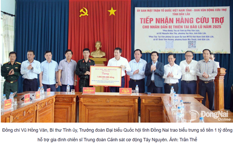 Đoàn công tác của tỉnh Đồng Nai cũng hỗ trợ 4 đơn vị thuộc Bộ Quốc phòng đang tham gia hỗ trợ khắc phục hậu quả thiên tai, bão lũ trên địa bàn tỉnh Đắk Lắk, mỗi đơn vị 300 triệu đồng, gồm: Lữ đoàn Đặc công 198, Binh chủng Đặc công; Lữ đoàn 682, Vùng 4 Hải quân; Trung đoàn 66, Sư đoàn 10 Quân đoàn 34; Trung đoàn không quân 910 (Trường Sĩ quan Không quân, Quân chủng Phòng không Không quân). Tổng kinh phí của đợt trao tặng này là 13,7 tỷ đồng.