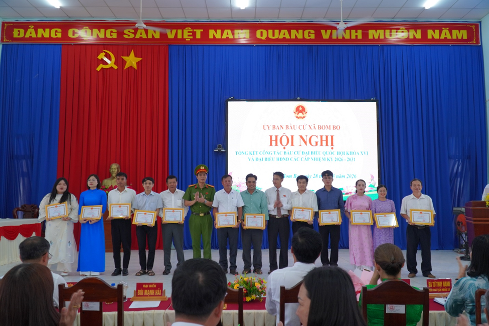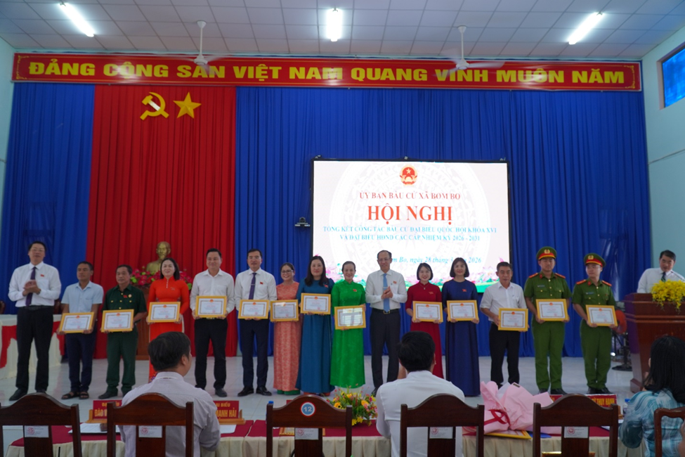 Nhân dịp này, Uỷ ban bầu cử xã Bom Bo đã trao Giấy khen cho 23 các tập thể, 73 cá nhân có thành tích xuất sắc trong công tác bầu cử, góp phần vào thành công chung của cuộc bầu cử đại biểu Hội đồng nhân dân các cấp nhiệm kỳ 2026 – 2031.