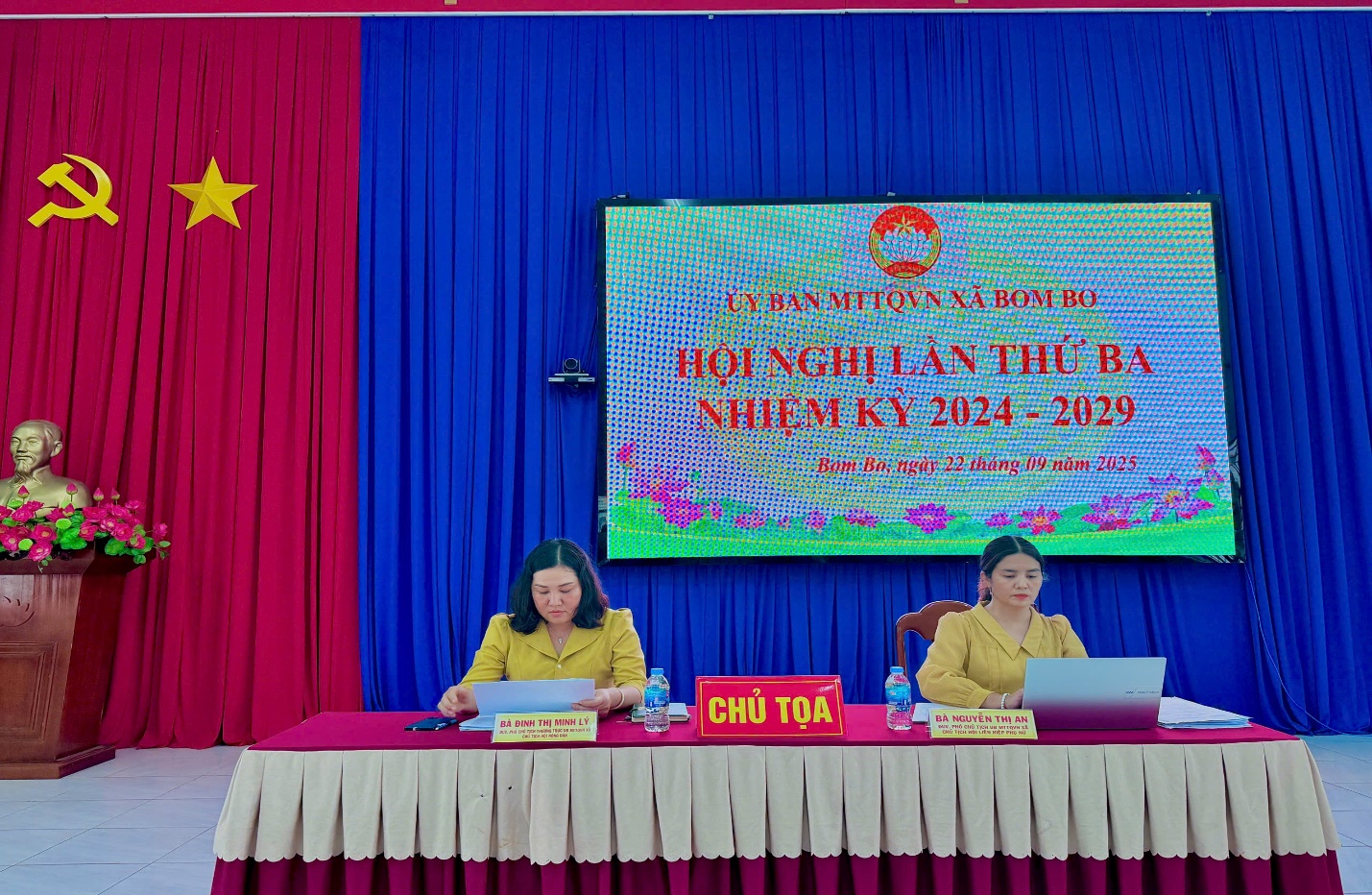 Hội nghị lần thứ 3 của Ủy ban MTTQ Việt Nam xã Bom Bo đã diễn ra trong không khí dân chủ, đoàn kết, trách nhiệm, tạo sự đồng thuận cao, thể hiện quyết tâm xây dựng và phát huy sức mạnh đại đoàn kết toàn dân tộc, vì sự phát triển bền vững của địa phương.