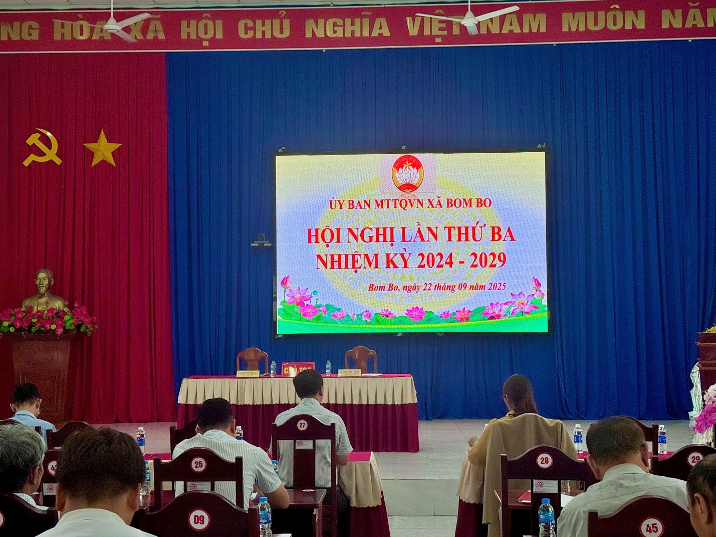 Đại hội Đại biểu Mặt trận Tổ quốc Việt Nam xã Bom Bo, nhiệm kỳ 2025 – 2030. Với phương châm “Đoàn kết - Dân chủ - Đồng thuận - Sáng tạo - Phát triển”, Đại hội có nhiệm vụ đánh giá kết quả thực hiện Nghị quyết Đại hội Đại biểu Mặt trận Tổ quốc Việt Nam xã nhiệm kỳ 2024 - 2029 và đề ra phương hướng, mục tiêu và chương trình hành động của Mặt trận Tổ quốc Việt Nam xã Bom Bo nhiệm kỳ 2025 - 2030. Trong nhiệm kỳ qua, Uỷ ban Mặt trận Tổ quốc Việt Nam xã Bom Bo đã tập trung lãnh đạo thực hiện tốt các nhiệm vụ được giao, nhất là việc huy động xây dựng khối đại đoàn kết toàn dân tộc…