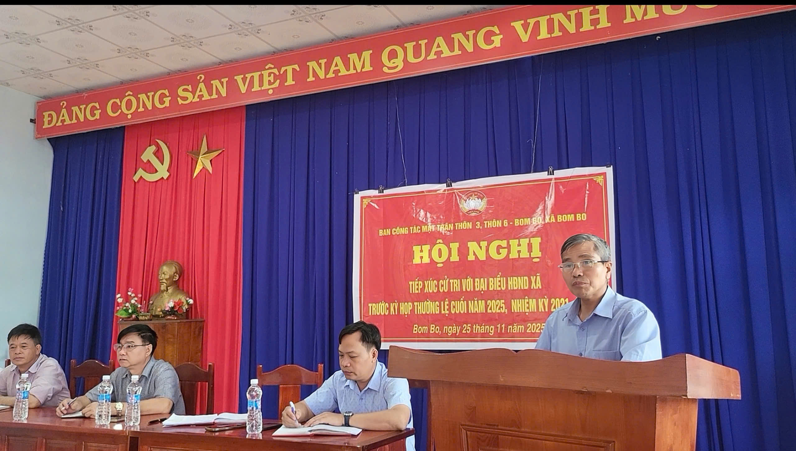 Tại thôn 6 Bom Bo, xã Bom Bo, Tổ đại biểu số 4 HĐND xã Bom Bo khoá VII, nhiệm kỳ 2021-2026 do ông Vũ Long Sơn - Tỉnh uỷ viên, Đại biểu HĐND tỉnh, Bí thư Đảng uỷ, Chủ tịch HĐND xã Bom Bo làm trưởng đoàn đến dự hội nghị tiếp xúc cử tri thôn 3, thôn 6 trước kỳ họp thường lệ cuối năm 2025.
