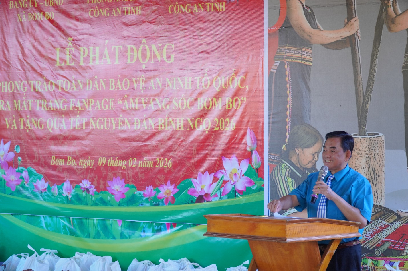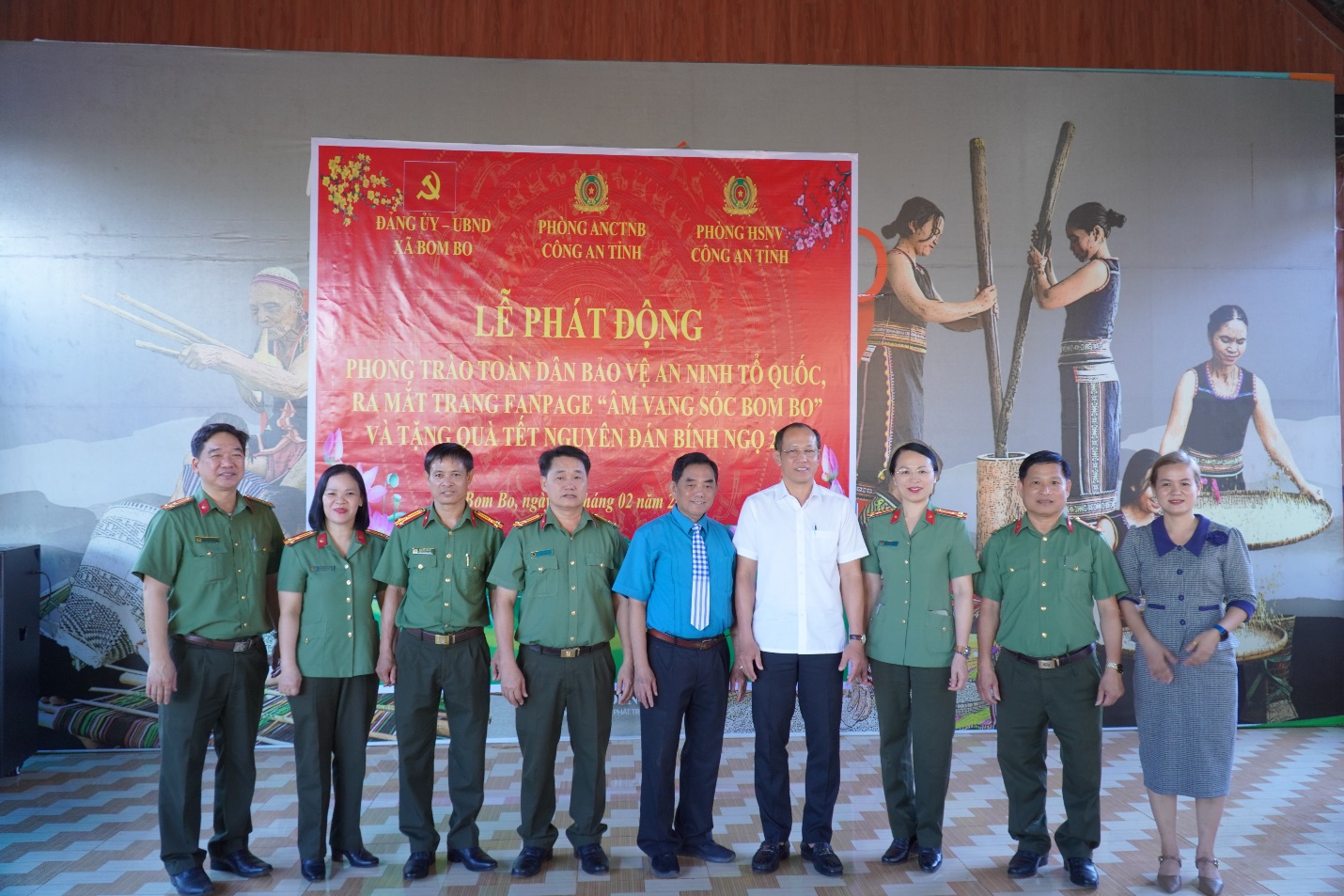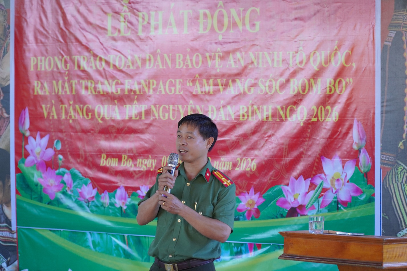 Tại buổi phát động, UBND xã Bom Bo đã báo cáo công tác đảm bảo an ninh quốc gia, giữ gìn trật tự an toàn xã hội, xây dựng phong trào toàn dân bảo vệ an ninh Tổ quốc trong thời gian qua; đồng thời đăng ký xây dựng mô hình Chốt an ninh khu bảo tồn sóc Bom Bo; ra mắt trang Fanpage Âm vang sóc Bom Bo nhằm tuyên truyền, lan tỏa giá trị lịch sử - văn hóa của Khu bảo tồn văn hóa dân tộc S'tiêng sóc Bom Bo, tỉnh Đồng Nai.