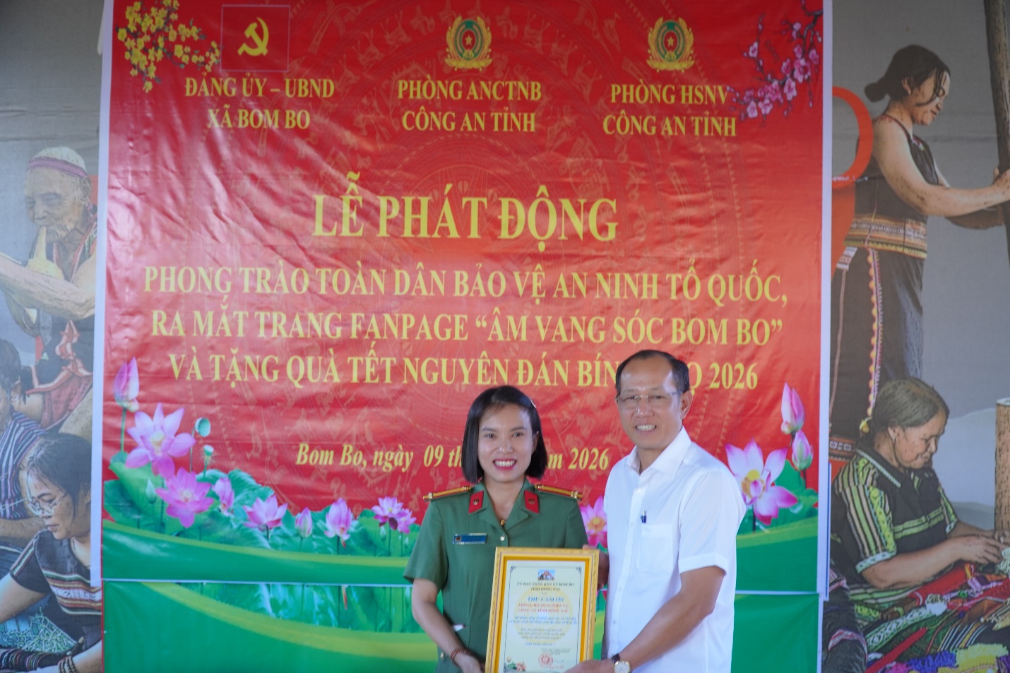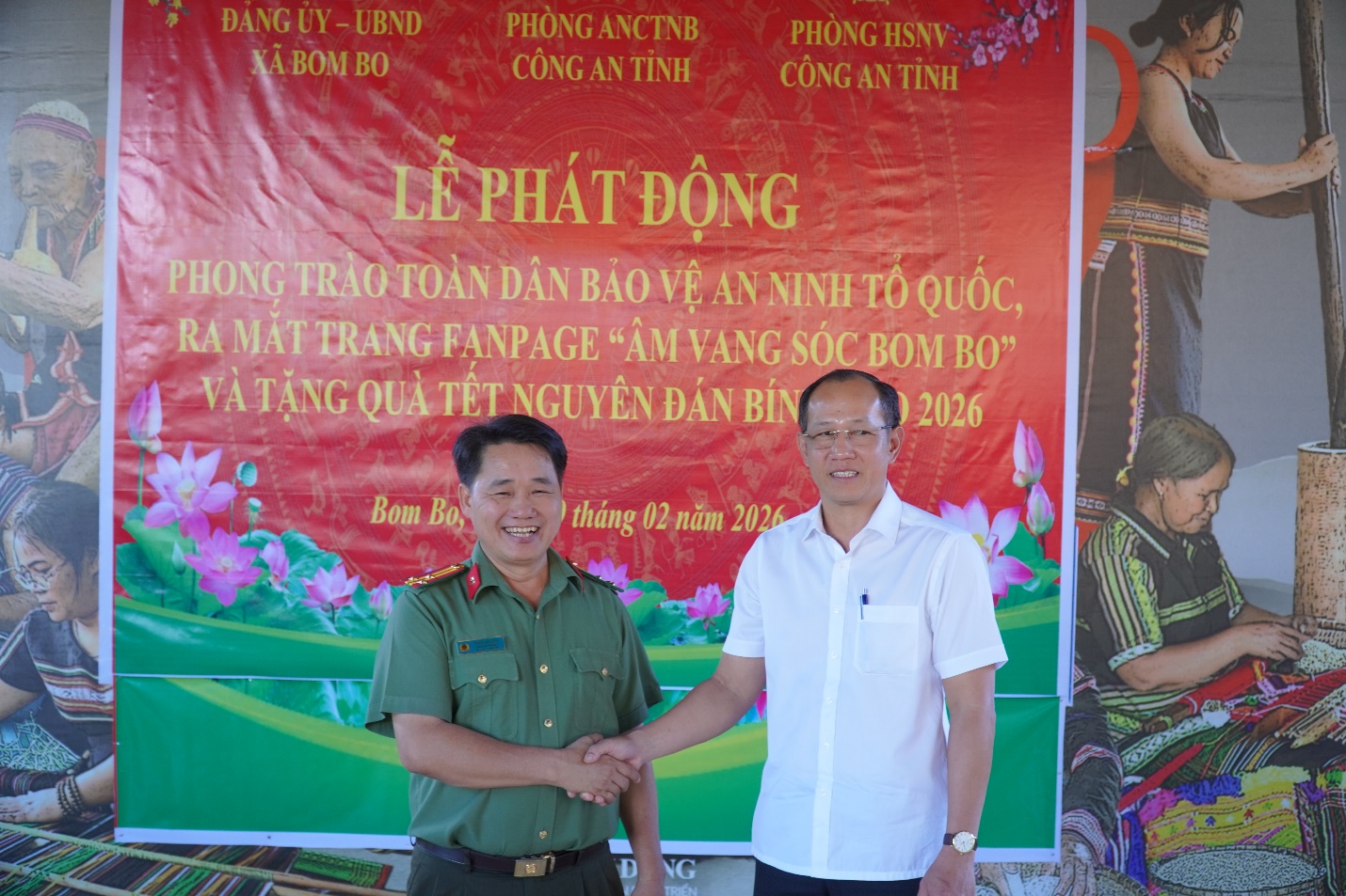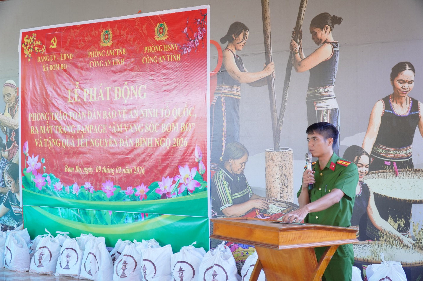 Tại buổi phát động, UBND xã Bom Bo đã báo cáo công tác đảm bảo an ninh quốc gia, giữ gìn trật tự an toàn xã hội, xây dựng phong trào toàn dân bảo vệ an ninh Tổ quốc trong thời gian qua; đồng thời đăng ký xây dựng mô hình Chốt an ninh khu bảo tồn sóc Bom Bo; ra mắt trang Fanpage Âm vang sóc Bom Bo nhằm tuyên truyền, lan tỏa giá trị lịch sử - văn hóa của Khu bảo tồn văn hóa dân tộc S'tiêng sóc Bom Bo, tỉnh Đồng Nai.