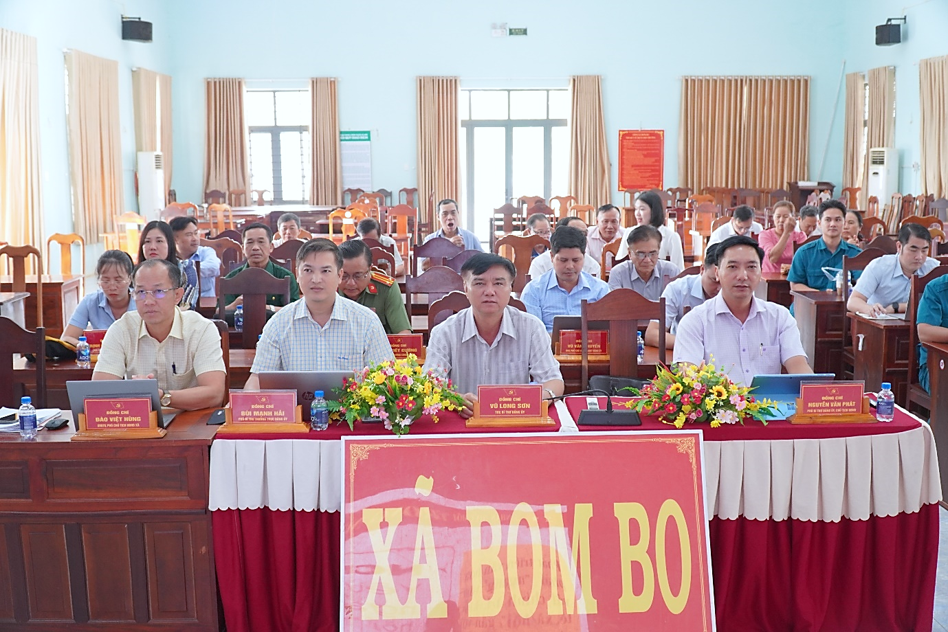 Chủ trì tại điểm cầu xã Bom Bo có đồng chí Vũ Long Sơn – Tỉnh ủy viên, Bí thư Đảng ủy, Chủ tịch HĐND xã Bom Bo; đồng chí Bùi Mạnh Hải – Phó Bí thư thường trực Đảng ủy xã; đồng chí Nguyễn Văn Phát – Phó Bí thư Đảng ủy, Chủ tịch UBND xã Bom Bo; cùng các đồng chí trong Ban Thường vụ, Ban Chấp hành Đảng bộ xã; Bí thư, Phó Bí thư các chi bộ trực thuộc; đảng viên, cán bộ, công chức, viên chức của xã.
