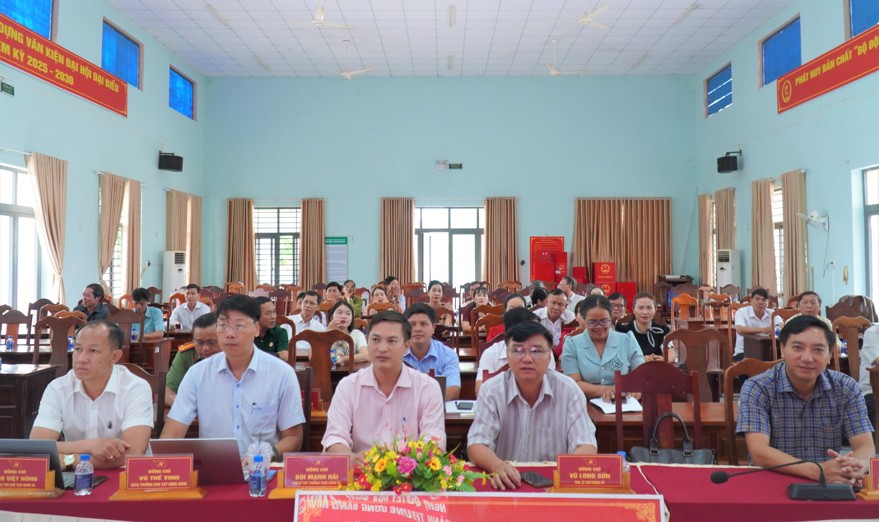 Chủ trì tại điểm cầu có đồng chí Vũ Long Sơn – Tỉnh ủy viên, Bí thư Đảng ủy, Chủ tịch HĐND xã; đồng chí Bùi Mạnh Hải – Phó Bí thư Thường trực Đảng ủy xã; Đồng chí Nguyễn Văn Phát – Phó Bí thư Đảng ủy, Chủ tịch UBND xã; cùng các đồng chí Ban Thường vụ, Ban Chấp hành Đảng bộ xã; lãnh đạo các ban, ngành, đoàn thể; Bí thư chi bộ; Trưởng, Phó các thôn; Ban Giám hiệu các trường học và toàn thể đảng viên thuộc các chi, Đảng bộ trực thuộc.