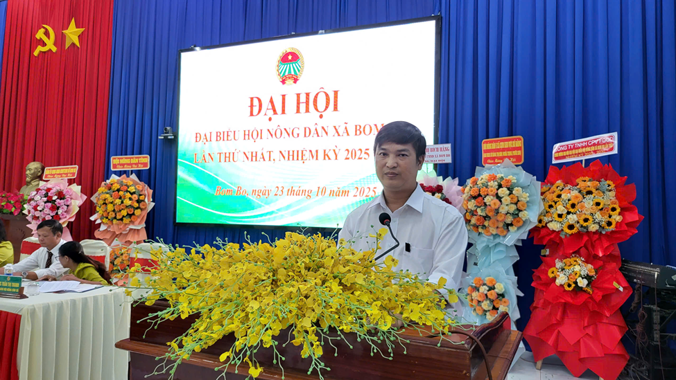 Phát biểu chỉ đạo tại Đại hội, ông Nguyễn Hữu Thành – Phó Chủ tịch Hội Nông dân tỉnh. Đánh giá cao tinh thần đoàn kết, nỗ lực của Hội Nông dân xã Bom Bo trong thời gian qua. Ông nhấn mạnh, nhiệm kỳ 2025 – 2030, Hội cần tiếp tục đổi mới nội dung, phương thức hoạt động, hướng mạnh về cơ sở, phát huy vai trò là trung tâm, nòng cốt trong các phong trào nông dân, tích cực tham gia xây dựng Đảng, chính quyền vững mạnh, xây dựng nông thôn mới nâng cao, nông thôn mới kiểu mẫu.