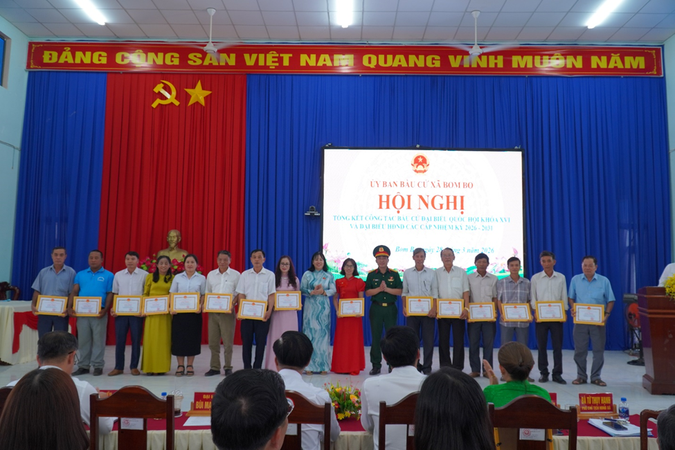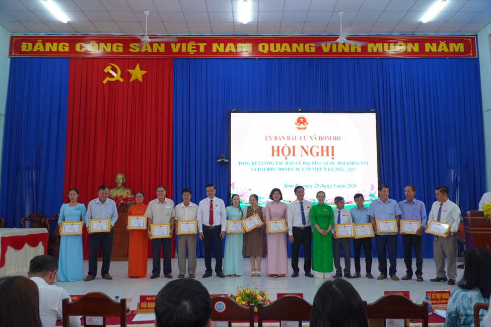 <div style="text-align: justify;"><span style="font-size:11pt"><span style="background:white"><span style="line-height:normal"><span style="font-family:Calibri,sans-serif"><span style="font-size:13.0pt"><span style="font-family:&#039;Times New Roman&#039;,serif"><span style="color:rgb(8, 8, 9);">&nbsp; &nbsp; Nhân dịp này, Uỷ ban bầu cử xã Bom Bo đã trao Giấy khen cho 23 các tập thể, 73 cá nhân có thành tích xuất sắc trong công tác bầu cử, góp phần vào thành công chung của cuộc bầu cử đại biểu Hội đồng nhân dân các cấp nhiệm kỳ 2026 – 2031.</span></span></span></span></span></span></span></div>