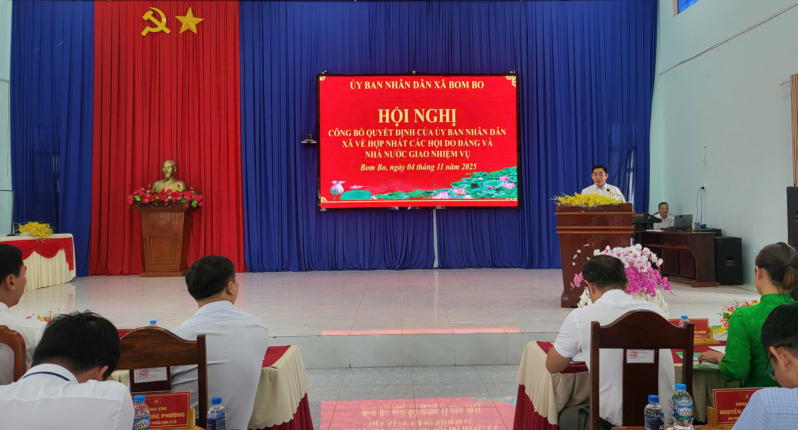 Tại hội nghị, thừa uỷ quyền của Chủ tịch UBND xã, ông Bùi Anh Tùng - Trưởng phòng Văn hoá xã hội đã công bố Quyết định hợp nhất Hội Khuyến học xã Bình Minh (cũ) và xã Bom Bo (cũ) thành Hội Khuyến học xã Bom Bo, Quyết định hợp nhất Hội Người cao tuổi xã Bình Minh (cũ) và xã Bom Bo (cũ) thành Hội Người cao tuổi xã Bom Bo và Quyết định hợp nhất Hội chữ thập đỏ xã Bình Minh (cũ) và xã Bom Bo (cũ) thành Hội chữ thập đỏ xã Bom Bo, tỉnh Đồng Nai.