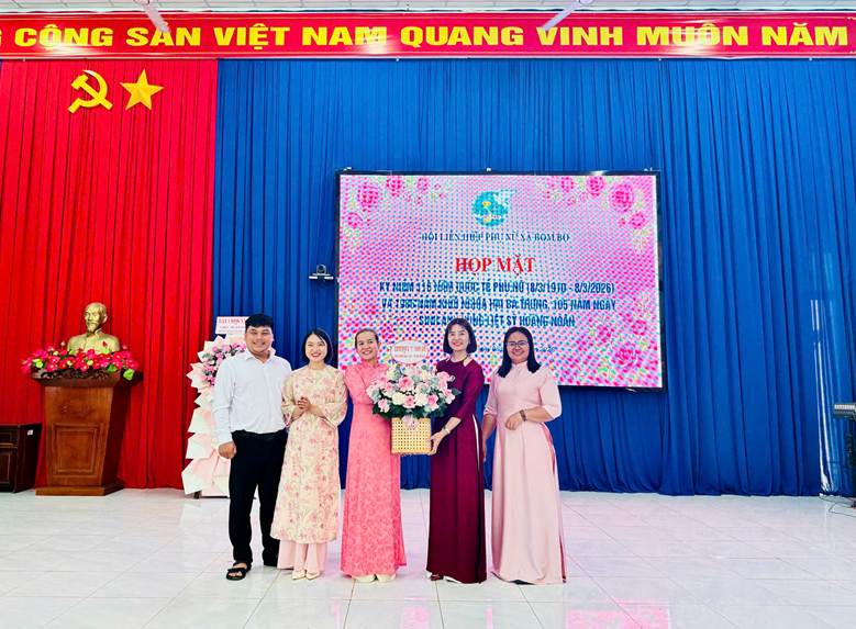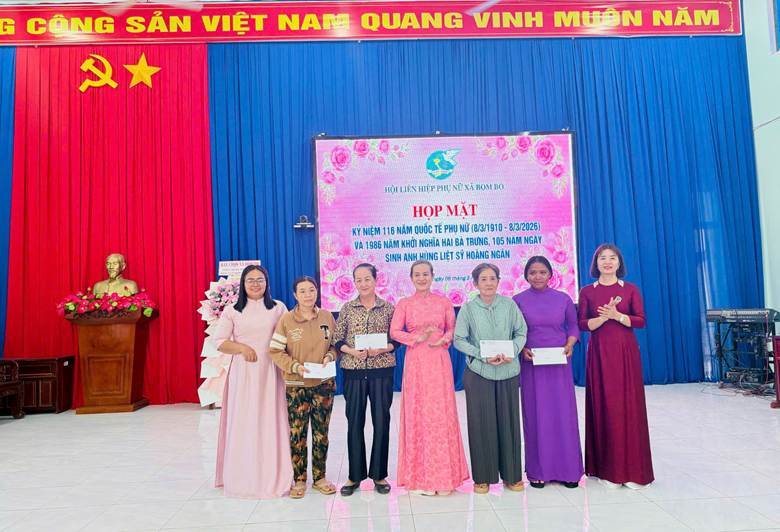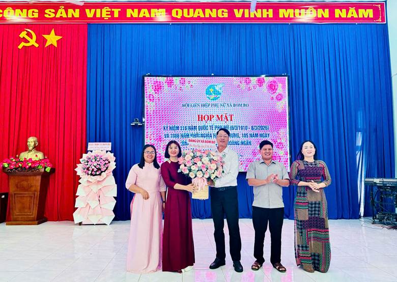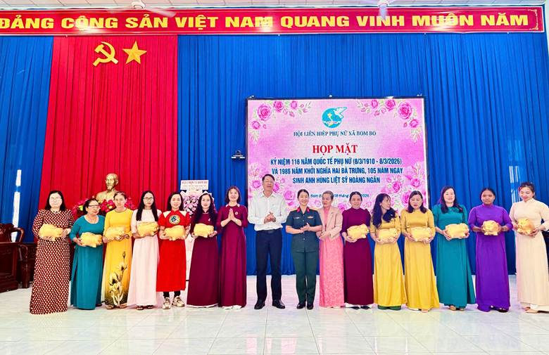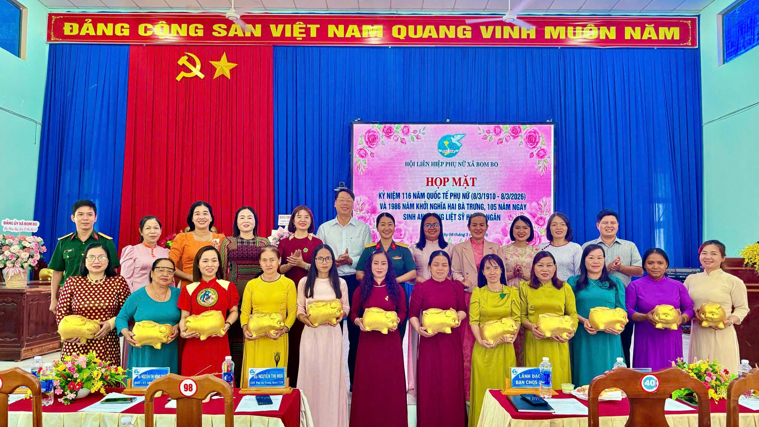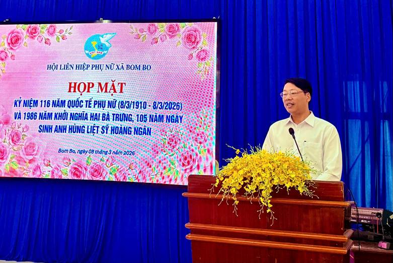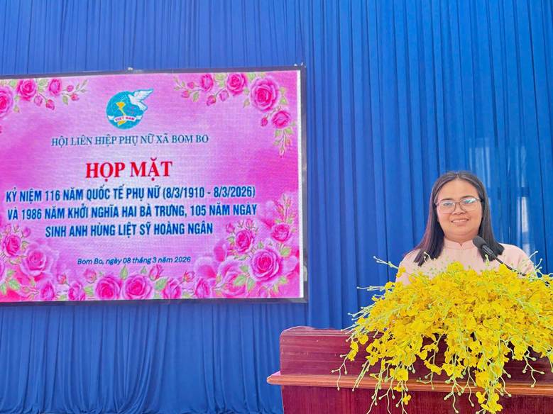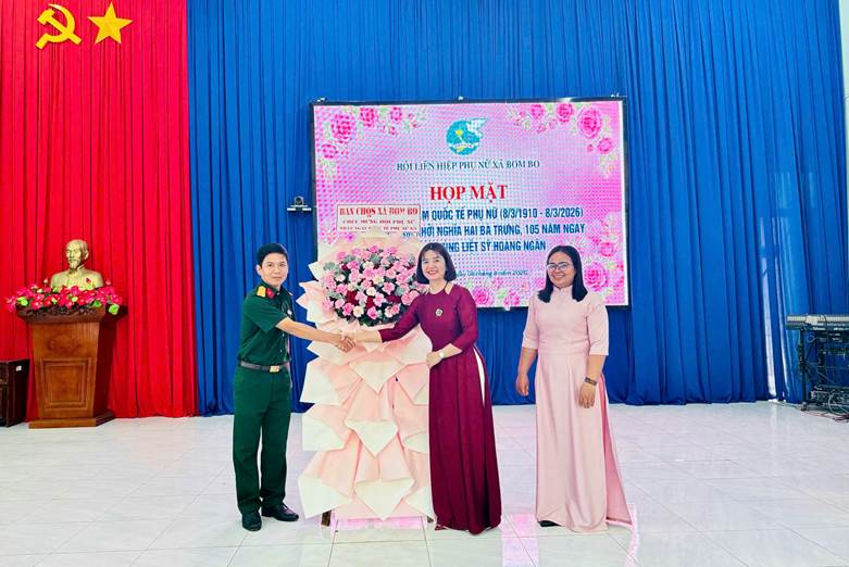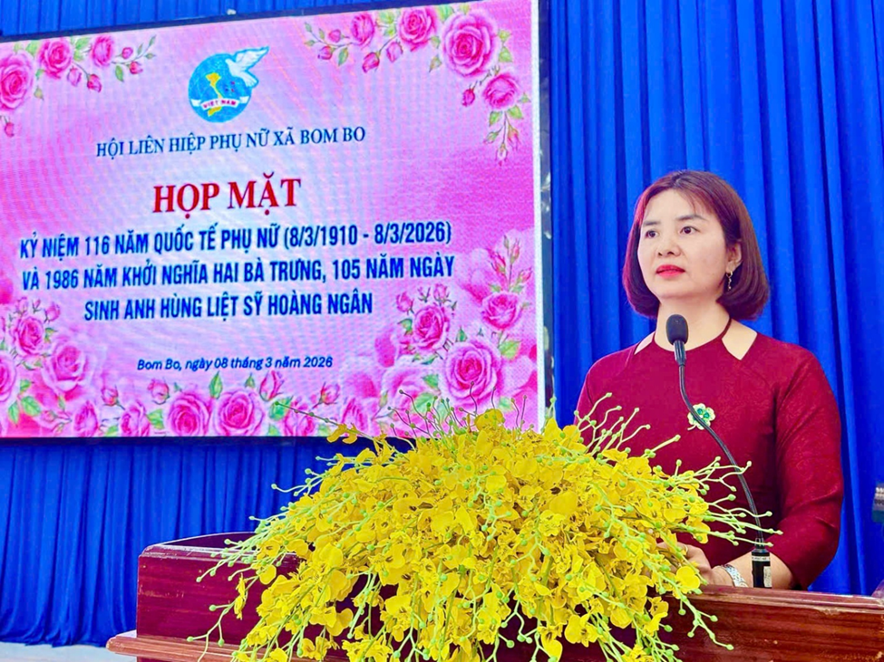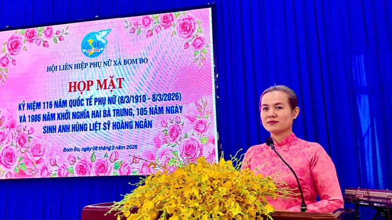 Sáng ngày 08/3/2026, tại Hội trường UBND xã Bom Bo, Hội Liên hiệp Phụ nữ xã đã tổ chức buổi họp mặt kỷ niệm 116 năm Ngày Quốc tế Phụ nữ 8/3 (1910–2026), 1986 năm Khởi nghĩa Hai Bà Trưng và 105 năm ngày sinh Anh hùng Liệt sĩ Hoàng Ngân (1921–2026).