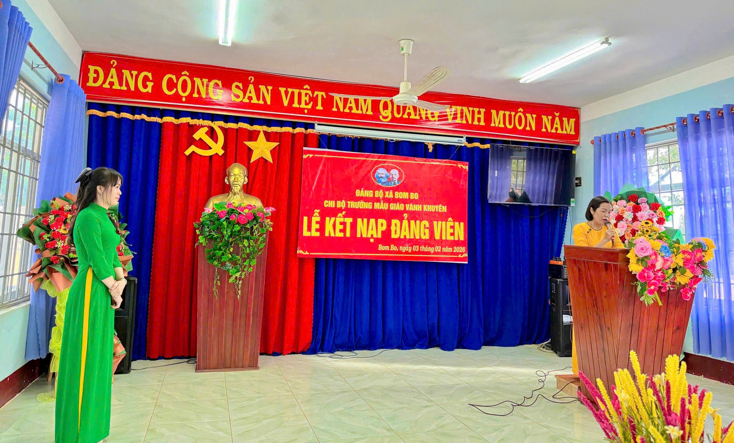 Được biết Chi bộ trường Mẫu giáo Vành khuyên kết nạp mơi 01 đảng viên là nữ, tổng số đảng viên hiện có là 10 đồng chí, trong đó 10 nữ. Đây cũng là lễ kết nạp Đảng viên mới đối với nữ ưu tú đầu tiên của năm 2026 thuộc xã Bom Bo, tỉnh Đồng Nai, nâng tổng số Đảng viên nữ toàn xã hiện nay là 155/445 đồng chí.