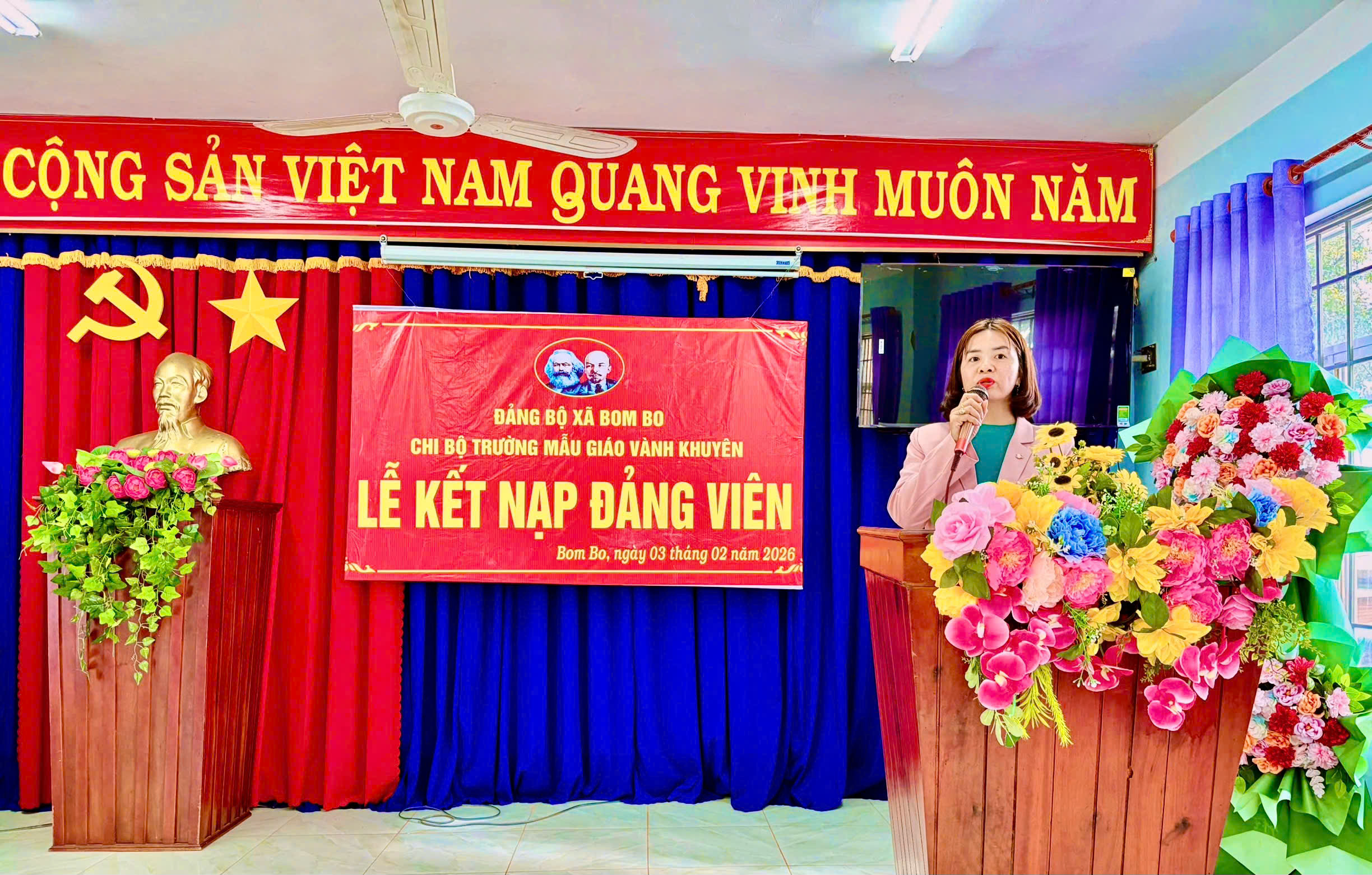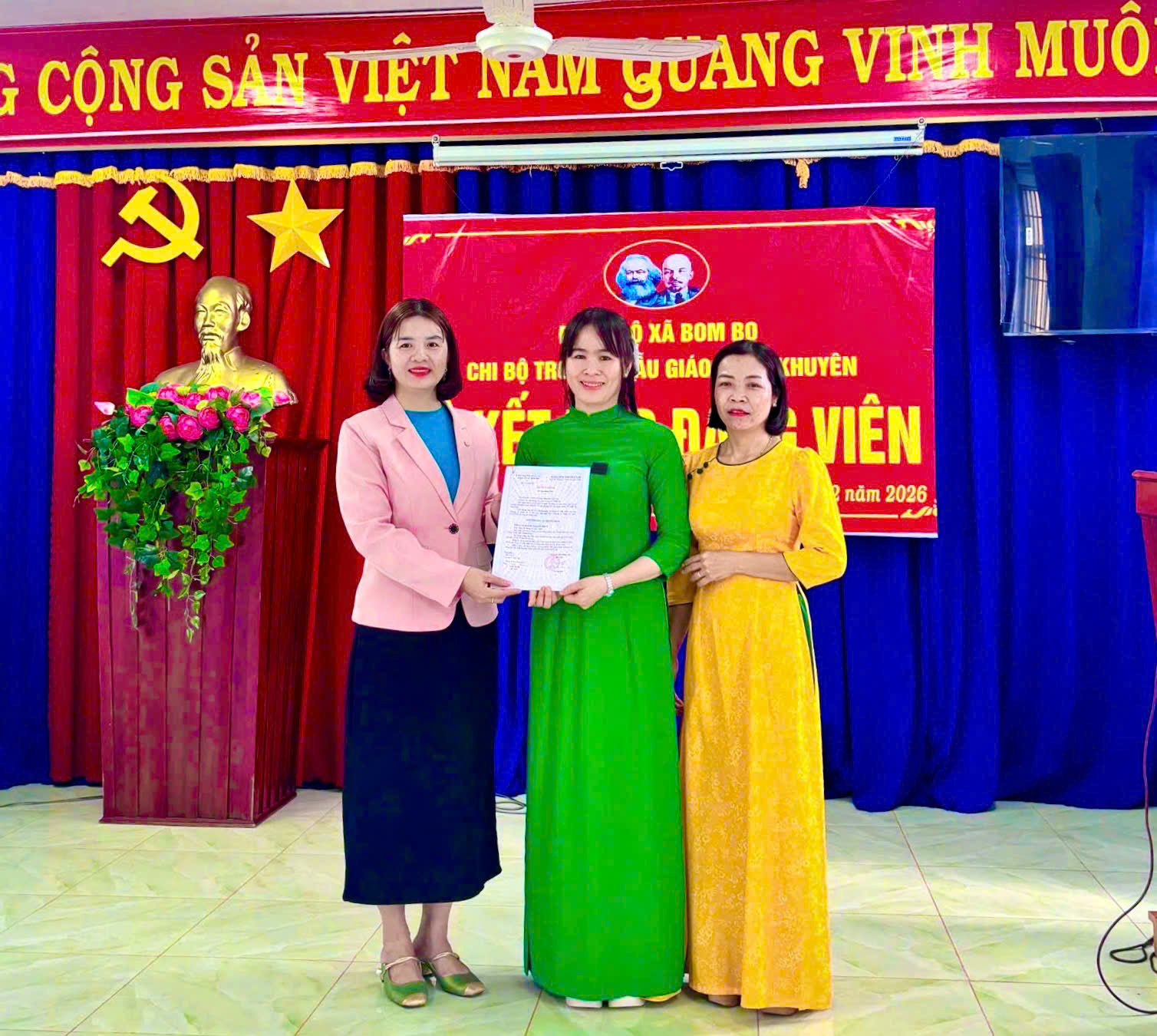 Sáng ngày 03/02/2026 Chi bộ trường Mẫu giáo Vành Khuyên, xã Bom Bo đã tổ chức Lễ kết nạp Đảng viên mới cho đồng chí Vũ Thị Vị - Giáo viên. Tham dự buổi lễ có đồng chí Nguyễn Thị An – Đảng uỷ viên – Phó Chủ tịch MTTQ VN – Chủ tịch Hội LHPN xã; đồng chí Nguyễn thị Hồng Dân – Phó Bí thư phụ trách Chi bộ - Phó Hiệu trưởng trường MG Vành khuyên và đông đủ 09 đảng viên Chi bộ.