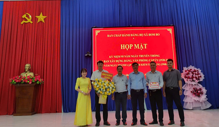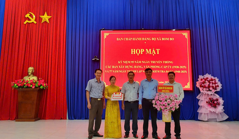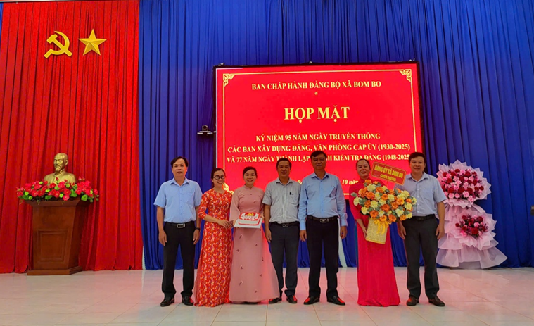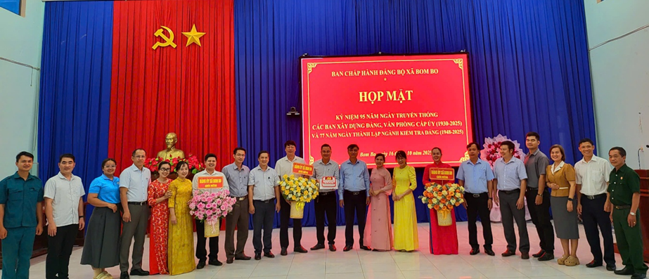 Ngày 16/10/2025, tại hội trường UBND xã Bom Bo, Đảng ủy xã Bom Bo long trọng tổ chức Họp mặt kỷ niệm 95 năm Ngày truyền thống các Ban Xây dựng Đảng, Văn phòng cấp ủy (1930 – 2025) và 77 năm Ngày truyền thống Ngành Kiểm tra Đảng (1948 – 2025). Tham dự buổi họp mặt có đồng chí Vũ Long Sơn – Tỉnh ủy viên, Bí thư Đảng ủy xã Bom Bo, đồng chí Vũ Thế Vinh – Ủy viên Thường vụ, Trưởng Ban Xây dựng Đảng, cùng các đồng chí trong Ban Chấp hành Đảng ủy, lãnh đạo các ban, ngành, đoàn thể, cán bộ, công chức và đảng viên trên địa bàn.