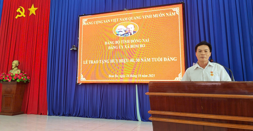 Ngày 16/10/2025, tại hội trường UBND xã Bom Bo, Đảng ủy xã long trọng tổ chức Lễ trao tặng Huy hiệu 40 năm và 30 năm tuổi Đảng cho các đảng viên tiêu biểu. Tham dự buổi lễ có đồng chí Vũ Long Sơn – Tỉnh ủy viên, Bí thư Đảng ủy, đại diện lãnh đạo Tỉnh ủy; cùng các đồng chí trong Ban Chấp hành Đảng ủy xã, lãnh đạo các ban ngành, đoàn thể, bí thư các chi bộ và toàn thể đảng viên trên địa bàn.